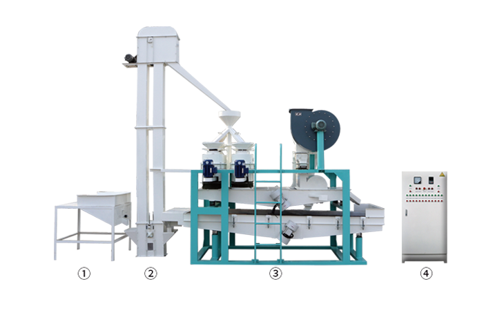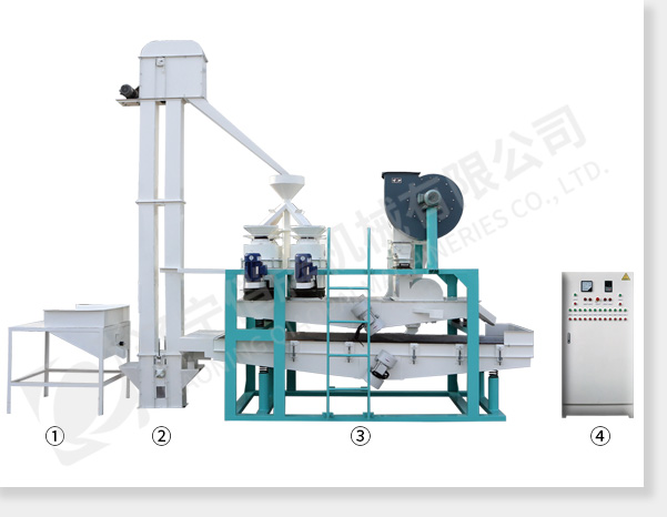 ① 裝料斗② 斗式升級機 ③ 脫殼、風選、分選主機設備 ④ 電器設備吃妻上癮柜